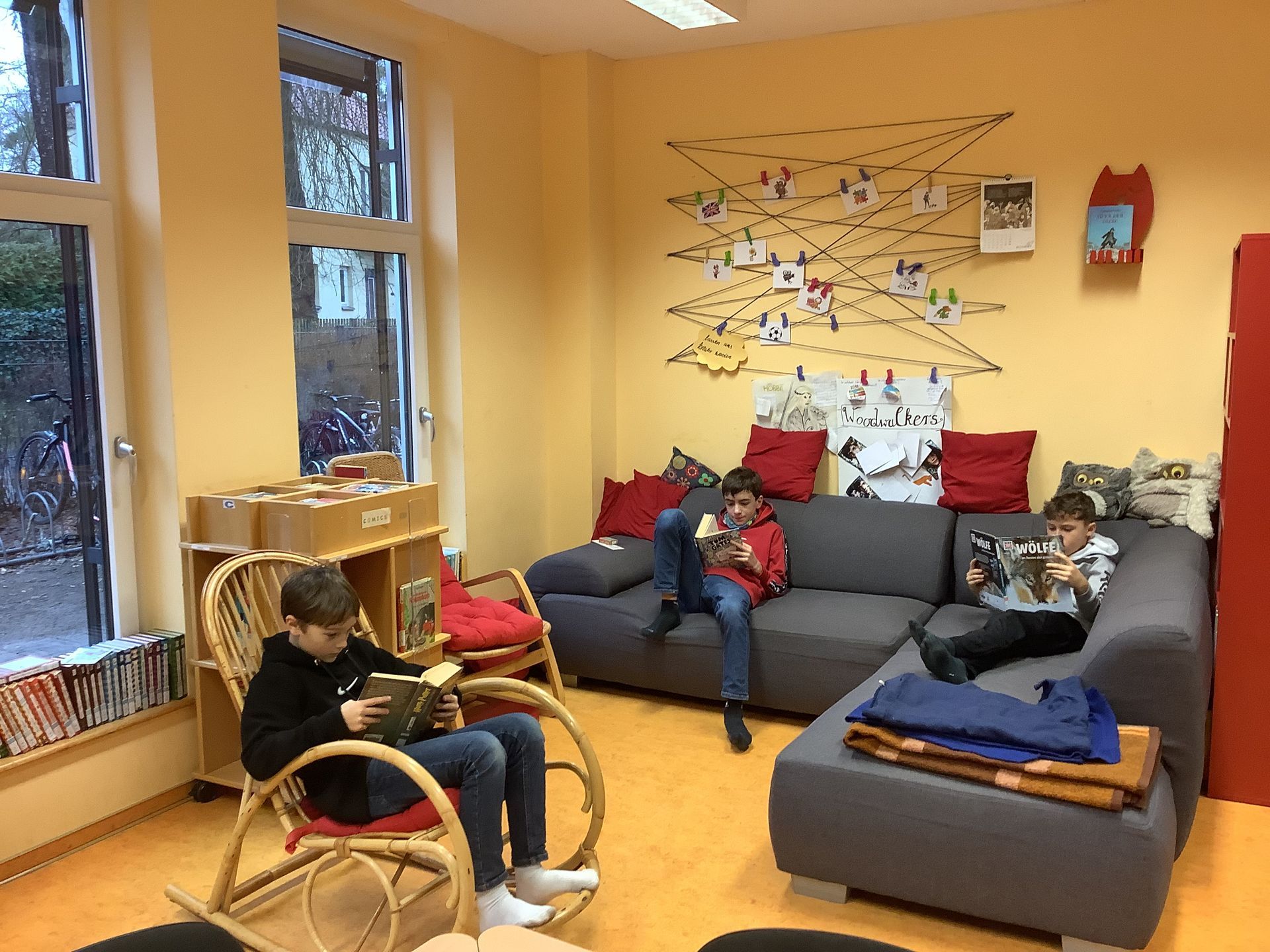 Klassenweise besuchen sie die Bibliothek, um gemeinsam an Lesestunden oder kleinen Projekten teilzunehmen.